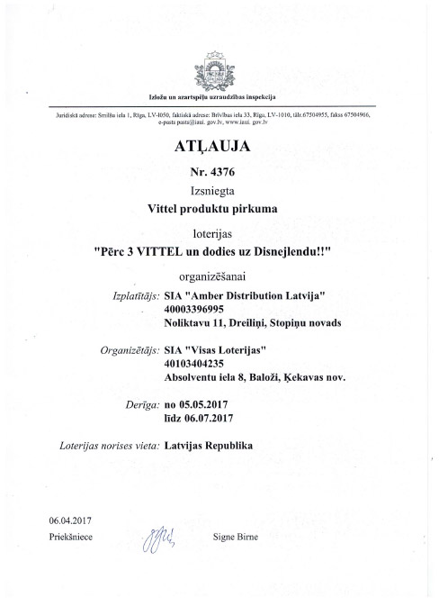 Preču loterijas „Pērc 3 VITTEL un dodies uz Disnejlendu!!” noteikumi